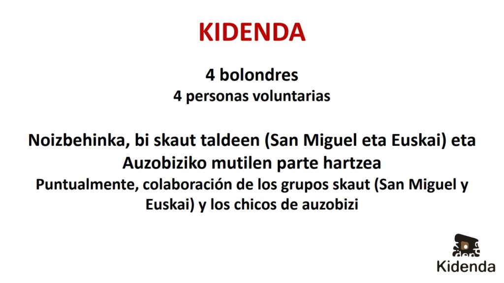 Kidenda es un proyecto de Comercio Justo, promovido por Alboan, Caritas Bizkaia y Misiones de Bilbao que nace a finales de 1996. El equipo de Kidenda Sestao, está formado por cuatro voluntarios permanentes que reciben colaboraciones puntuales de otras personas, como son los grupos skaut y los chicos de Auzobizi. Hacen entre seis y ocho ferias anuales repartidas entre las parroquias de Sta María y la del Sagrado Corazón. Organizan charlas en las que se da a conocer qué es el comercio justo y en qué consiste este modelo de relaciones comerciales justas basadas en la dignidad de las personas.