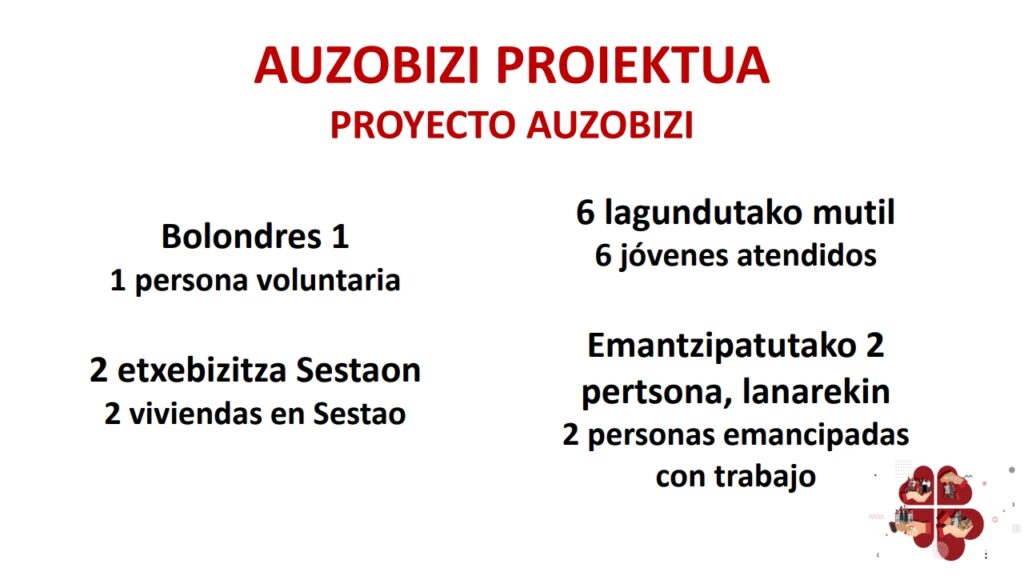 El proyecto de Cáritas de apoyo comunitario AUZOBIZI, se enmarca dentro del programa de acompañamiento a personas jóvenes extranjeras en situación de calle. En colaboración con el centro formativo Otxarkoaga y alineado dentro de la estrategia diocesana de Comunidades Acogedoras tiene como objetivo la inmersión comunitaria de personas jóvenes en itinerarios avanzados de inclusión favoreciendo soluciones habitacionales adaptadas y referencias positivas y estables de proximidad en el entorno comunitario.